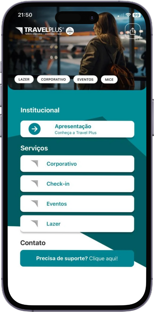 Com ele, você tem controle total sobre as viagens corporativas, seus colaboradores realizam check-in sem complicação e os clientes ainda podem solicitar orçamentos de lazer ou eventos de forma simples. É a tecnologia como aliada para transformar a experiência de viagem em algo prático, seguro e integrado.