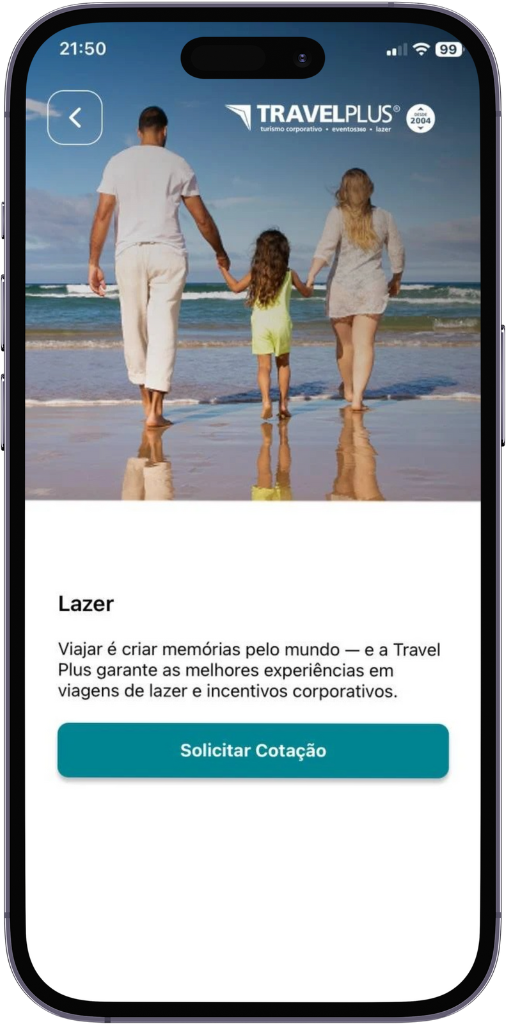 Porque nem só de compromissos profissionais vive um viajante, o aplicativo também oferece a opção de solicitar cotações para viagens de lazer. Seja para férias em família, escapadas de fim de semana ou roteiros internacionais, você tem acesso a um atendimento exclusivo para planejar sua viagem turística com a mesma excelência que já conhece no corporativo.